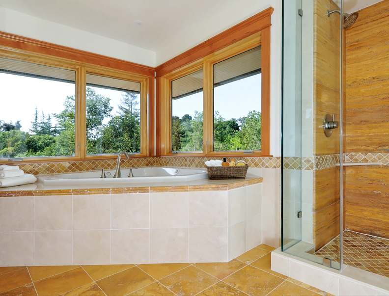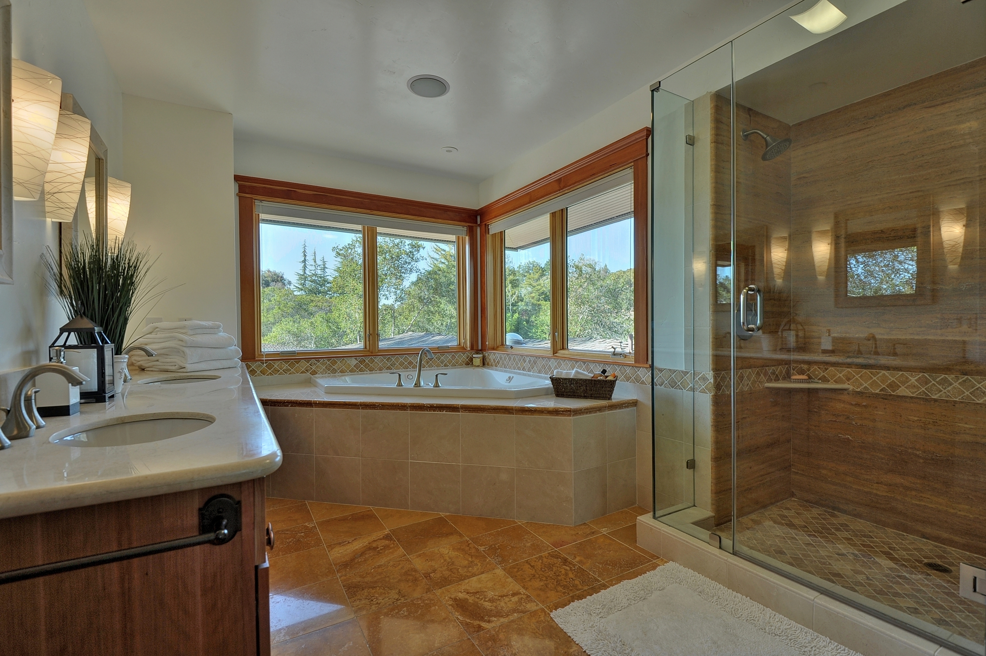 Upstairs Master Bathroom (#4)This bathroom has a dramatic golden travertine slab shower with two Hansgrohe Talis Thermobalance controls to provide his and hers convenience and safety. The Crema marble slab counter on the cherry cabinets contains two undermount Ovalyn sinks with Moen Eva faucets. The corner Jacuzzi whirlpool tub with a Moen Eva tub filler is surrounded by a Crema Marfil Select marble deck. Maintenance access for the whirlpool motor is through the right side of the deck and access to the heater is through the third full tile in the front. A separate marble makeup center provides unique three-way task lighting from six Besa wall sconces. These lights let you check your makeup colors under candlelight, daylight, and office lighting conditions. At the sinks, task lighting is provided by four soft incandescent wall sconces. The efficient, quiet Panasonic fan-light provides ventilation and ambient light. A motion sensitive Taco D'mand hot water recirculator under the sink provides convenience while still being energy efficient and water wise. The bathroom is wired with a GFCI outlet under the tub deck for a towel warmer. A low voltage plate on the west wall provides network, video, and telephone access; and two ceiling speakers are part of the whole house audio system with the control in the master bedroom. A separate cubicle contains the high efficiency WaterSense-compliant Kohler Kelston toilet.