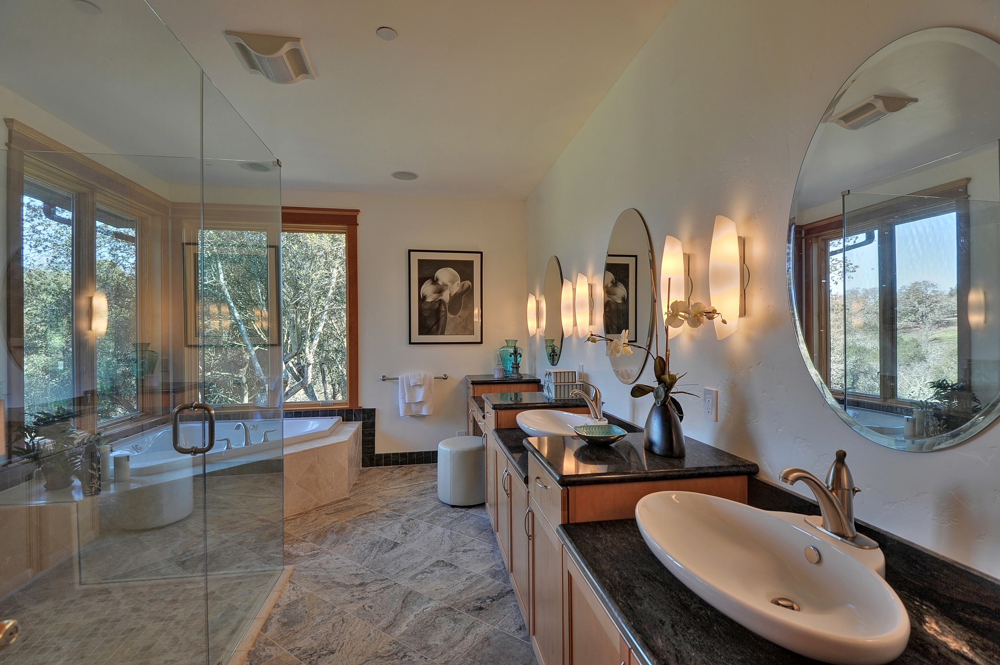BathroomsMain Floor Master Bathroom (#1)This bathroom is appointed in Cosmic Black granite slab countertops, maple cabinets, and Philadelphia travertine tile. It features a long wall of cabinetry compartmentalized to accommodate a makeup area plus two Porcher Kyomi vessel sinks with Danze Antioch faucets. The oversized curbless shower has two Hudson Reed shower systems each with rainspout head, hand-held spray, and body sprays. A corner Jacuzzi whirlpool tub with a Danze roman tub filler overlooks the rear grounds. Access for the whirlpool motor is through the right panel of the deck and access for the heater is through the second diamond tile in the front. Task lighting is provided by six soft incandescent Lite Source Daen luminaires; and the efficient, quiet Panasonic fan-light provides ventilation and ambient light. The bathroom is wired with an outlet on a timer for a towel warmer, as well as an outlet under the sink for a hot water recirculator. A low voltage plate on the east wall provides network, video, and telephone access; and three ceiling speakers are part of the whole house audio system with the control in the master bedroom. A separate cubicle contains the high efficiency WaterSense-compliant Kohler Kelston toilet.