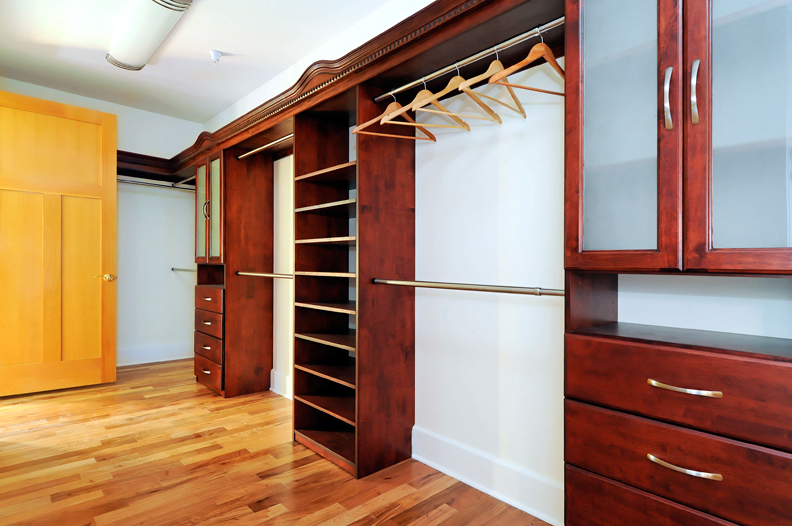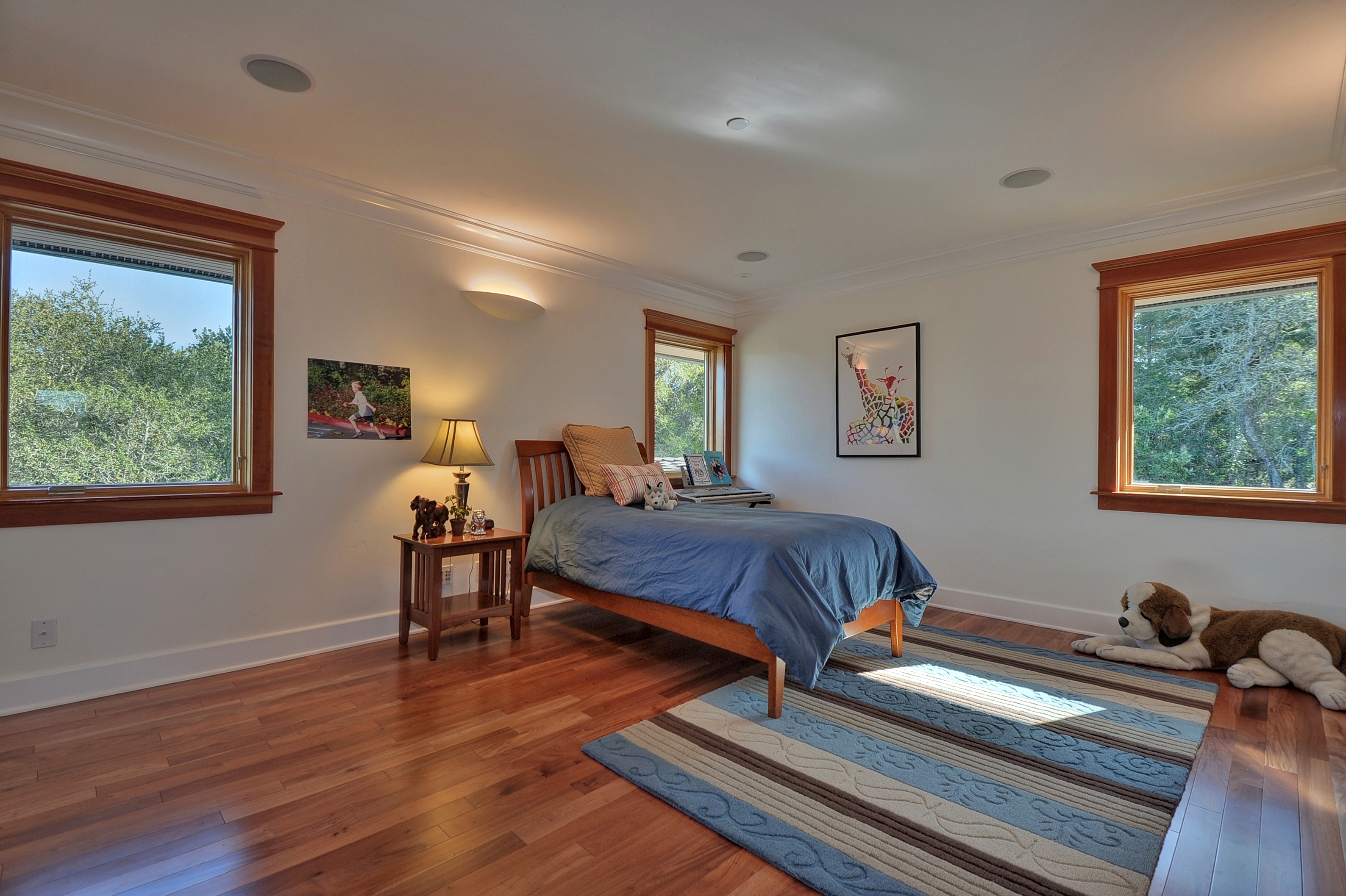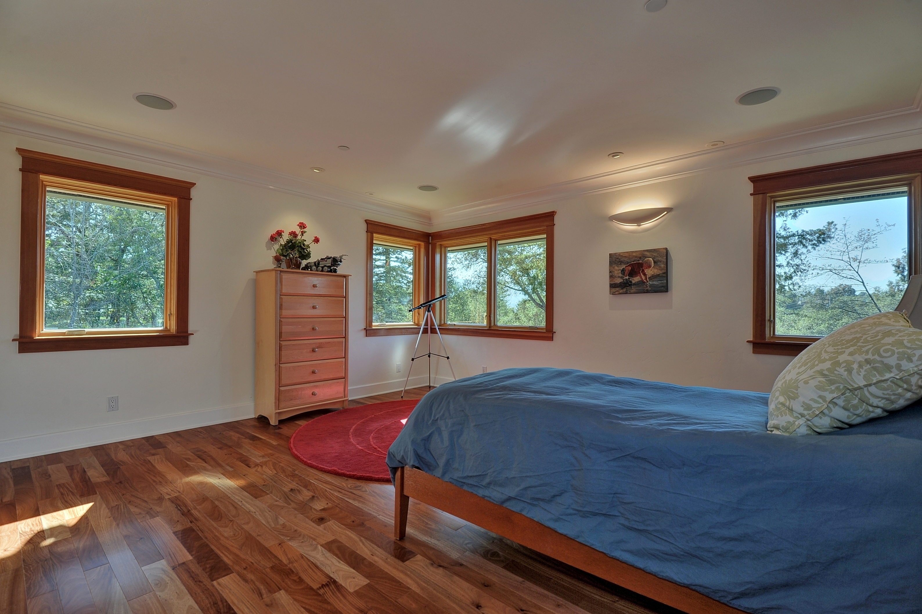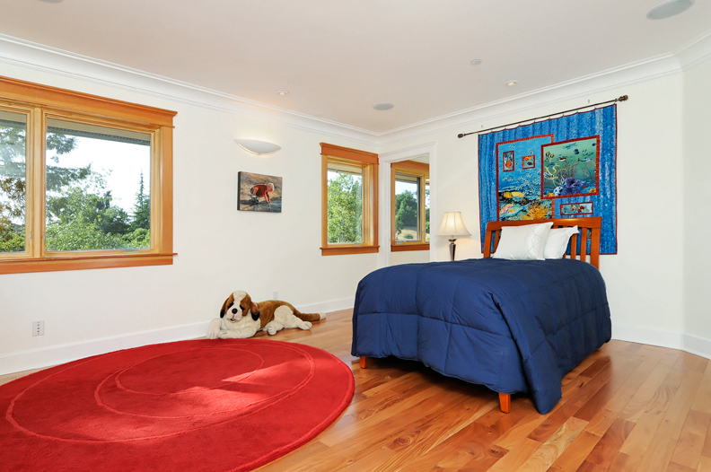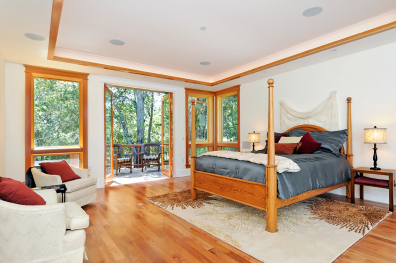 Main Floor Master Bedroom (#1)In its own wing off the family room and preceded by an art niche, this lovely and spacious retreat has a private deck with custom curved copper and redwood railing, coffered ceiling with soft cove lighting, large windows overlooking the oak trees and lawn, and dual-entrance customized wood closet for ample wardrobe storage.
