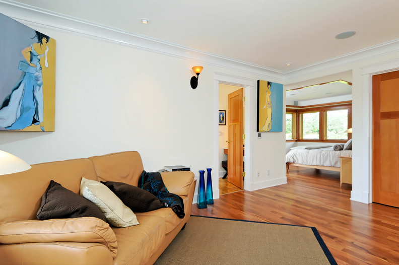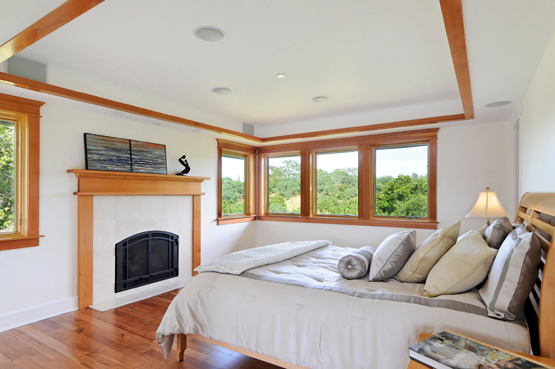 Upstairs Master Bedroom (#4)This multi-room suite begins with a sitting room that connects to an intimate reading area overlooking the western hills and then continues into the bedroom where a fireplace is outlined in Crema Marfil marble and surrounded with reclaimed Douglas fir for the mantelpiece; a coffered ceiling provides soft cove lighting; a full wall of windows overlooks the rear grounds and nearby hills; a customized walk-in closet with two entrances provides ample wardrobe storage.