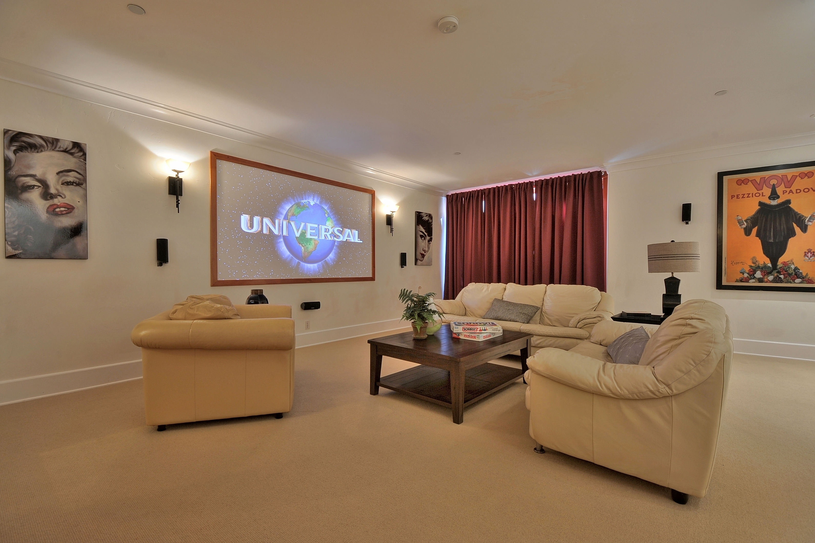 Home Theater, Wine Cellar, and PlayroomHome TheaterThe double Simpson French fir doors are surrounded by a glass transom and sidelights to bring natural light right to the staircase. The comfortable media room has a Harmon Kardon HKTS-18 7.1 speaker system; a high performance receiver (70 Watts/channel); a fir framed projection screen; and both component video (NTSC) and HDMI (HDTV) wiring for a projector. The Godfrey Hirst carpet feels soft underfoot and still conducts the radiant heat while improving the home acoustics. A maple cabinet holds the electronics for the network, video, and whole house audio systems.
