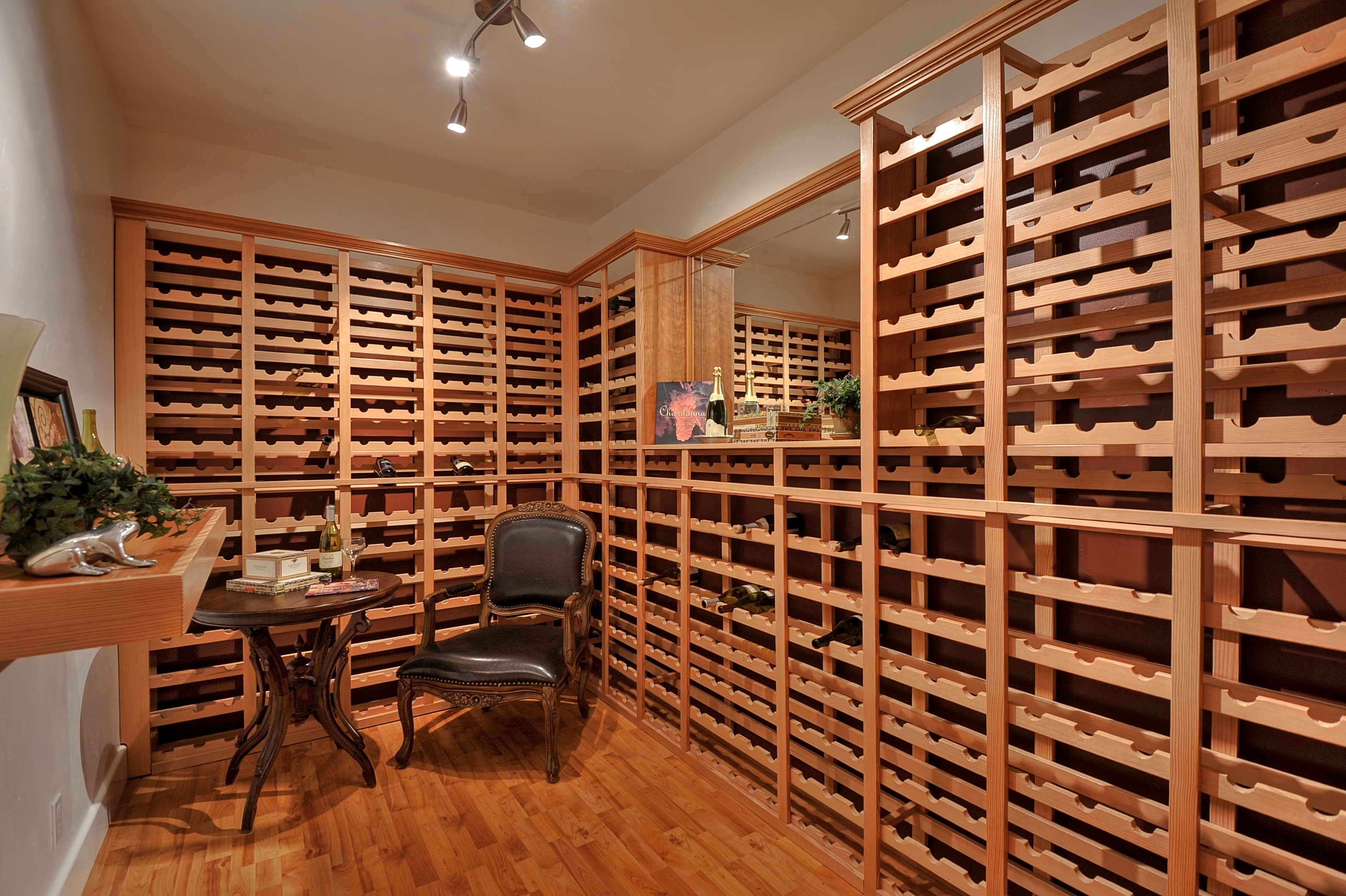 Wine CellarA wine cellar has custom vertical grain Douglas Fir racks for 550 bottles of wine. This room is well-insulated and has a weatherstripped door to keep it thermally separate from the rest of the house. The two concrete walls stay close to ground temperature (low 60s) with a huge thermal mass, so the temperature will not vary as much over the seasons.